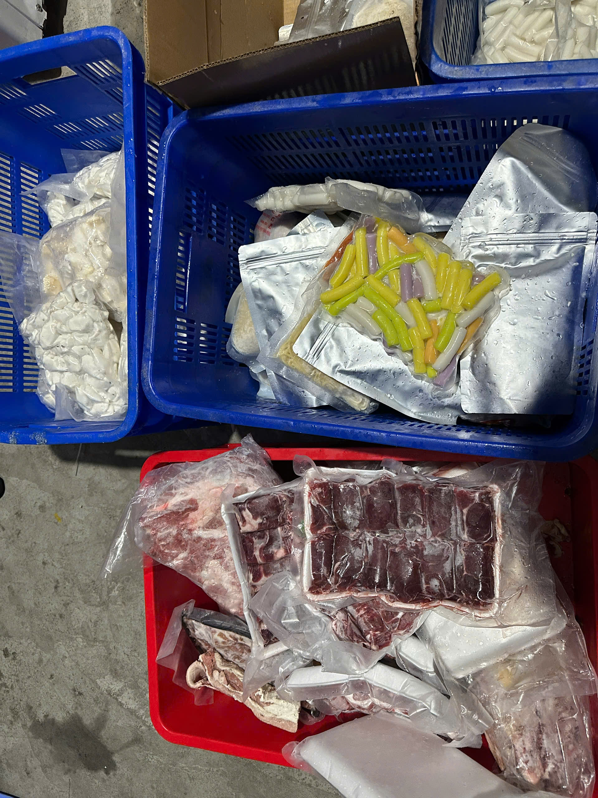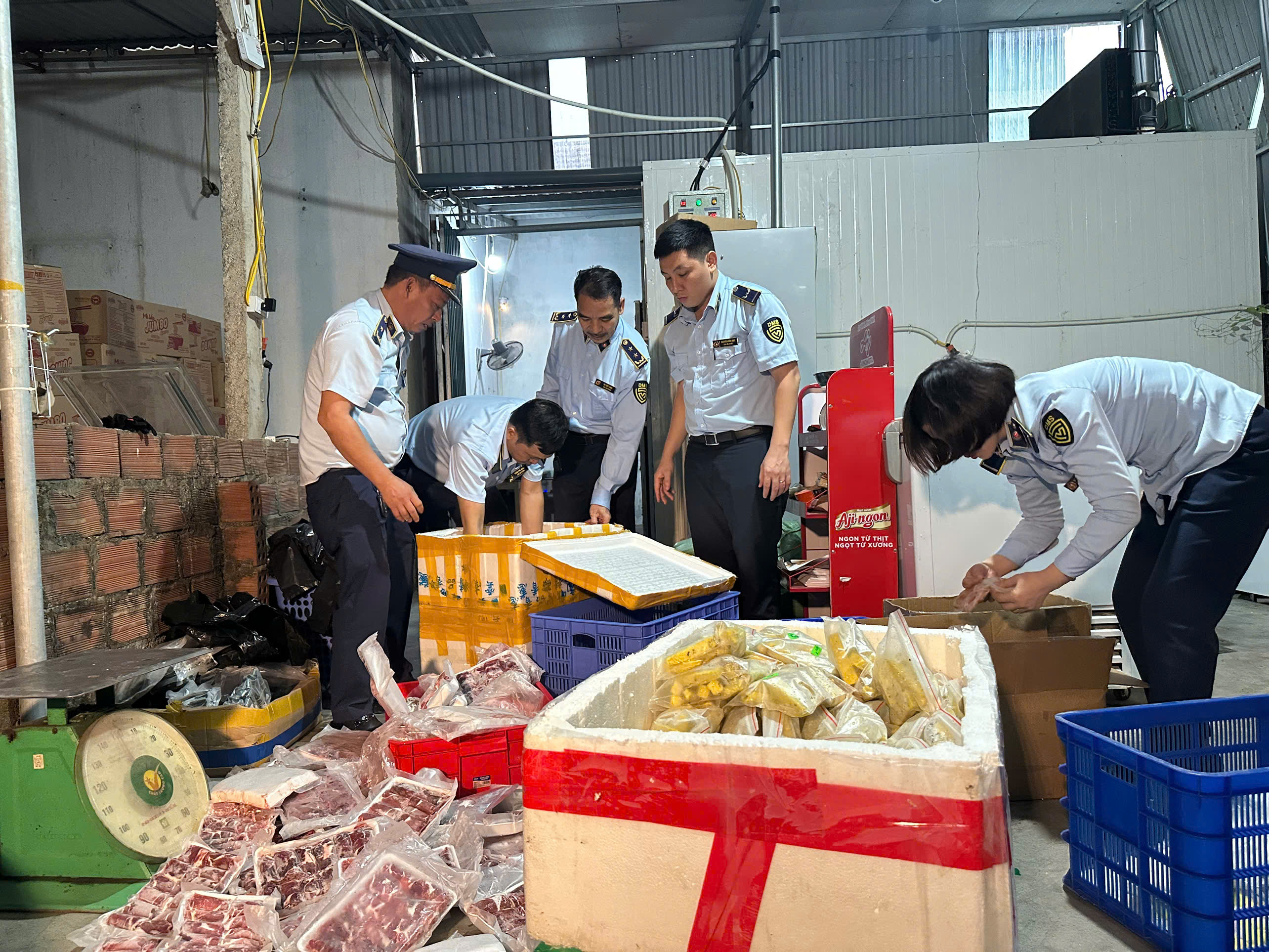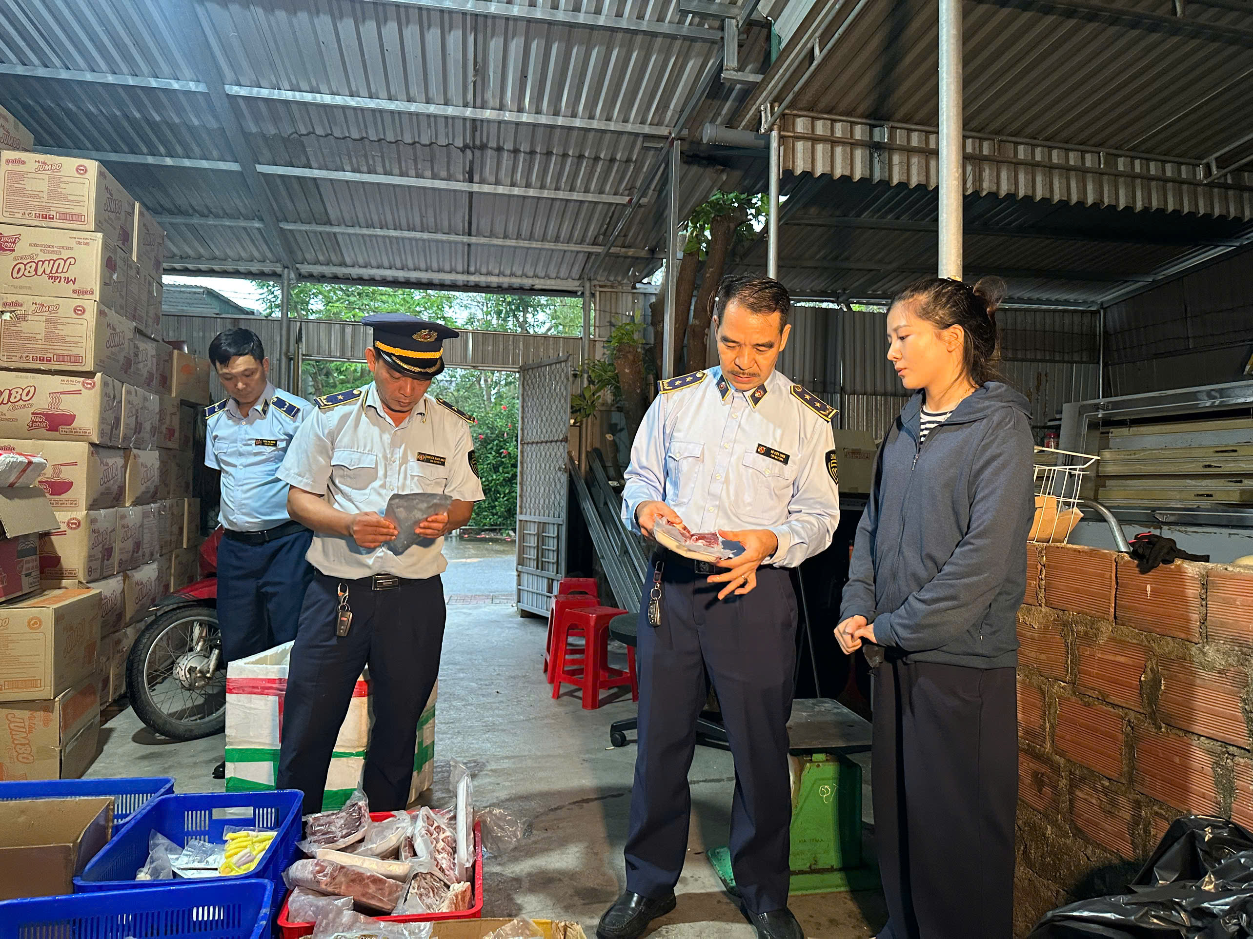 Tại thời điểm kiểm tra, Đoàn kiểm tra phát hiện cơ sở đang kinh doanh một số hàng hóa gồm: 23 kg thịt bò, 12 kg thịt trâu, 15 kg nem nướng, 10 kg bánh bèo, 7 kg nui, 18 kg khoai lang thanh, 11 kg mỳ Ý và 20 kg khoai lang kén; tổng trọng lượng 116 kg, tổng trị giá hàng hóa khoảng 8.282.000 đồng. Toàn bộ số hàng hóa nêu trên đều có dấu hiệu chuyển màu, bốc mùi hôi thối.
