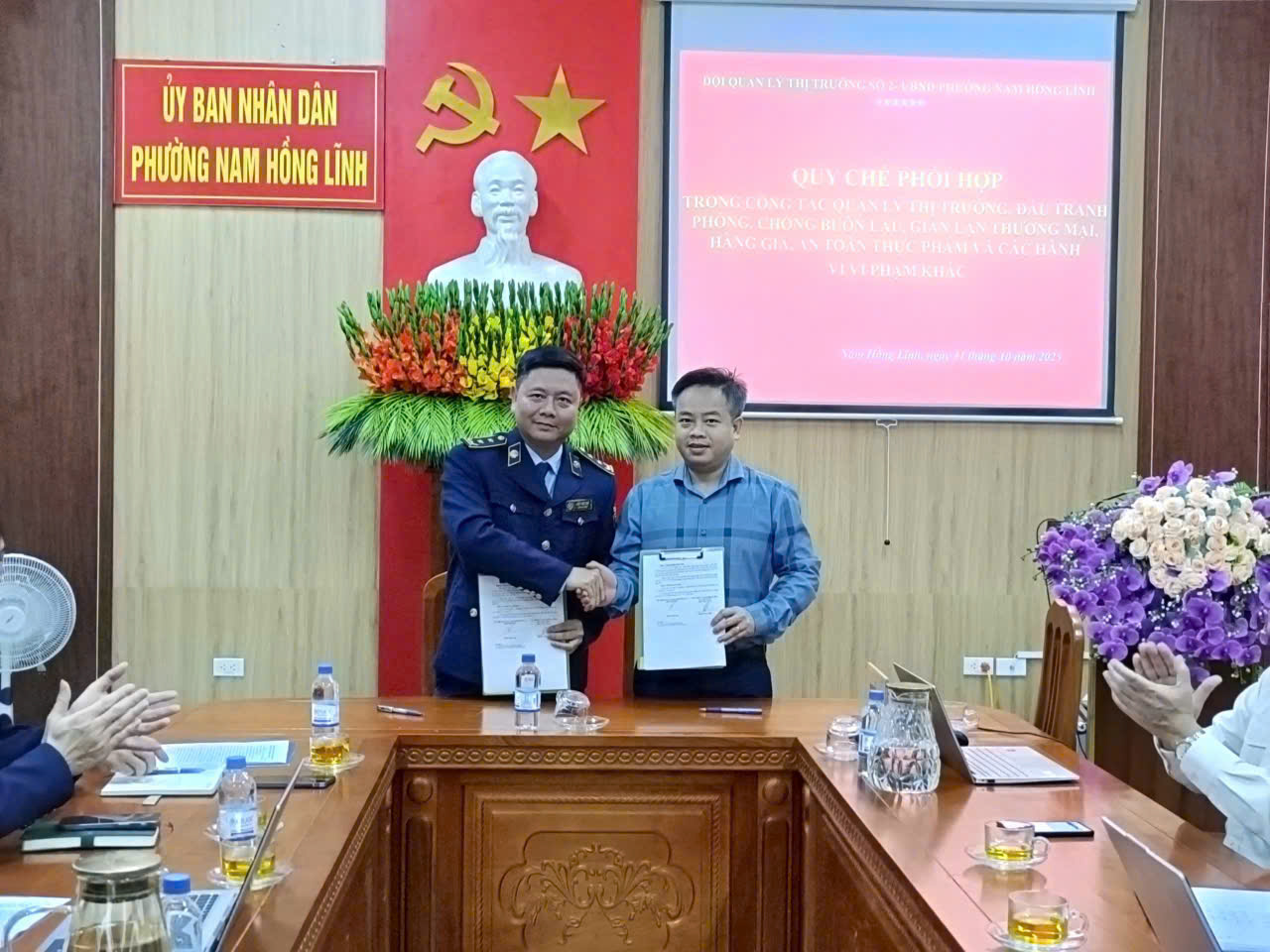 Sáng ngày 31/10/2025, tại trụ sở UBND phường Nam Hồng Lĩnh, buổi lễ ký kết Quy chế phối hợp được tổ chức trang trọng, thể hiện tinh thần quyết tâm, trách nhiệm và sự phối hợp chặt chẽ của hai đơn vị trong việc tăng cường công tác quản lý, kiểm tra, giám sát thị trường trên địa bàn.